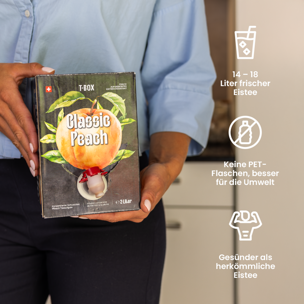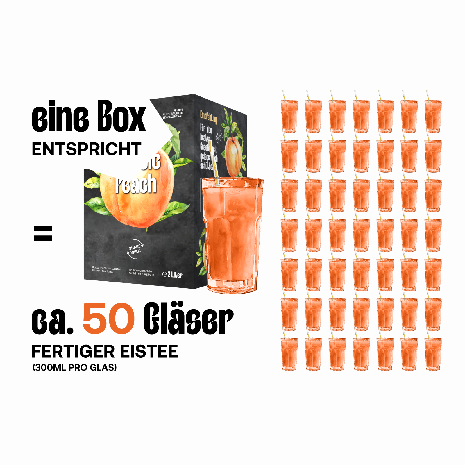 Aus nur 2 Litern T-Box-Konzentrat bereitest du im Handumdrehen 14–18 Liter trinkfertigen Eistee zu. Einfach mit Wasser mischen, kalt geniessen – und schon hast du erfrischenden Tee für jede Gelegenheit.