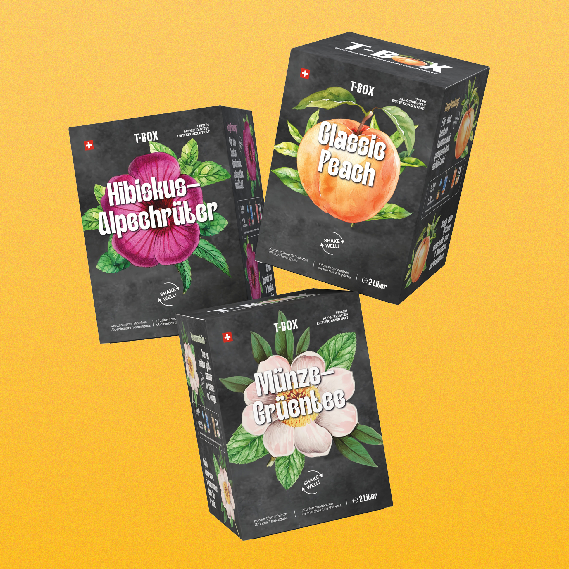 Alle drei Sorten. Ein Paket. 🧊 - Das perfekte Starterpaket für alle, die T-Box richtig kennenlernen wollen – Classic Peach, Hibiskus Alpenkräuter & Grüntee Minze in einer Box.